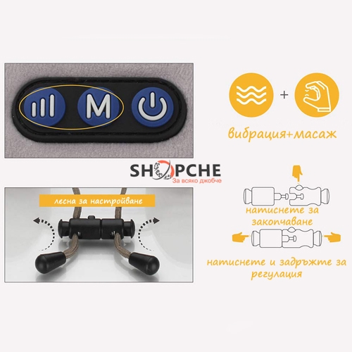 Масажорът има няколко функции – Масаж, вибрация, масаж и вибрация, масаж, вибрация и подгрев.