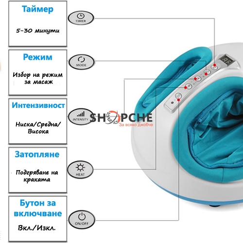 Той нежно масажира краката Ви. Уредът симулира масажни действия сякаш Ви масажира човек. Има различни режими на работа. Уредът помага при болка в мускулите и облекчава болките в краката.