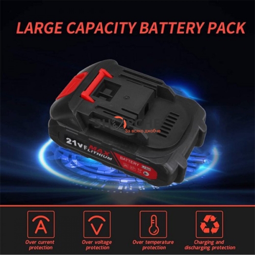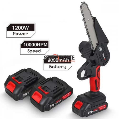 Спецификации:Батерия: 21VИзходна мощност: 1200WОбороти на празен ход: 10000rpmМедна намоткаРежим на захранване: литиева батерияКапацитет на батерията: 9000mahПълна дължина на веригата: около 15,24 см / 6"Дължина на направляващата плоча: около 18,7 см / 7,4"Цвят: черно и червено