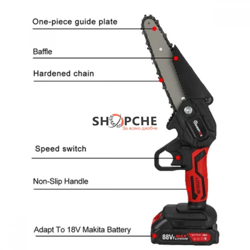 Пакета включва1 x Резачка1 х Верига1 x Водеща плоча2 x Li-ion батерия1 х Гаечен ключ1 x отвертка1 x зарядно устройство (220V)1 x Опаковъчна кутия