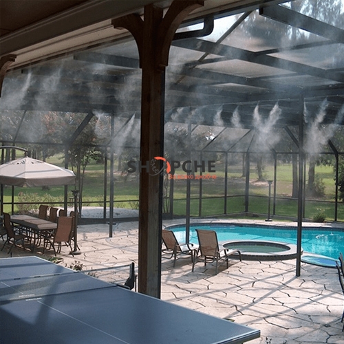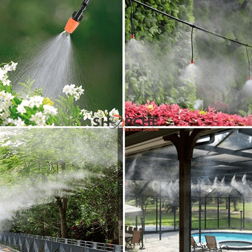 Системата образува водна мъгла при разпръскването на водата, която охлажда въздуха при горещите летни температури.
