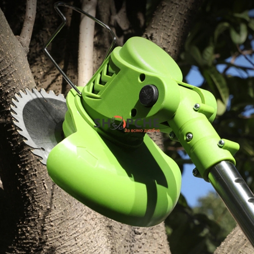 Освен тример, машината може да се използва и като резачка за клони и средно дебели дървета с включения диск в комплекта.