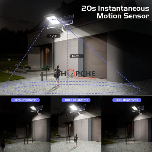 Автоматично превключване при здрач и разсъмване. Дистанционно управление, което може да се използва за настройване на продължителността на светене до 3, 5 или 8 часа, а яркият режим - до полу-светъл или напълно ярък режим. LED прожектора, е водоустойчив прожектор с IP степен на защита IP66 и е подходящ за осветяване на вътрешен двор, билборд, градина, пътека, гараж и др.