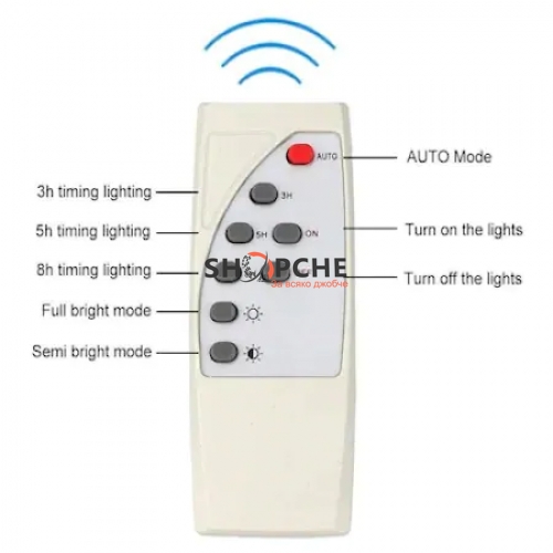 Дистанционно управление: настроено на автоматично ВКЛ. / ИЗКЛ. / От здрач до зазоряване / пълен ярък режим / полу-ярък режим или настройка за час.