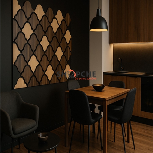 Панелът се монтира лесно върху равна повърхност с помощта на лепило или винтове. Благодарение на геометричната си форма, позволява гъвкаво подреждане и креативни комбинации – за акцентни зони или цялостно облицоване на стени.