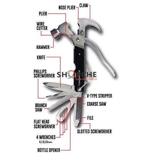 Многофункционалният инструмент събира на едно място цели 18 инструмента. Изработен е изцяло по практичната функционалност на швейцарските ножчета, но в себе си включва доста интересни и полезни инструменти.
