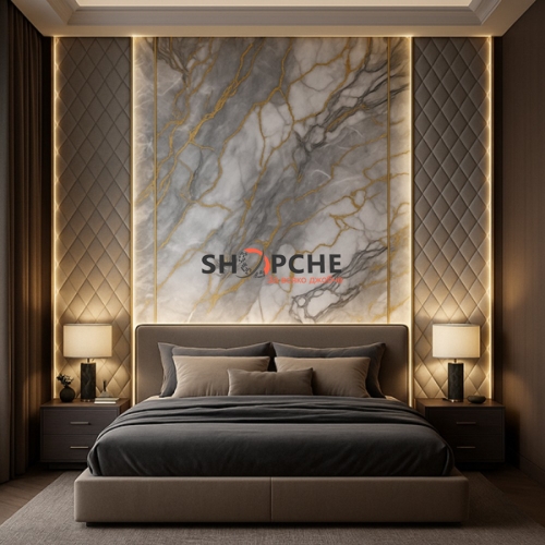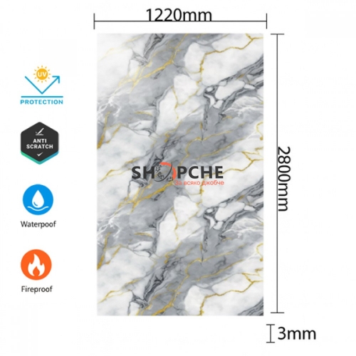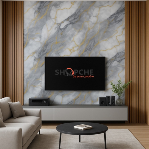 Този PVC панел с мраморен ефект в сиво със златни жилки е идеален избор за създаване на съвременен, стилен и луксозен интериор у дома или в офиса.