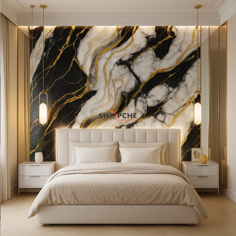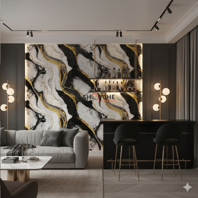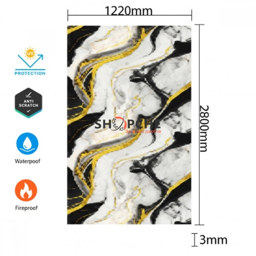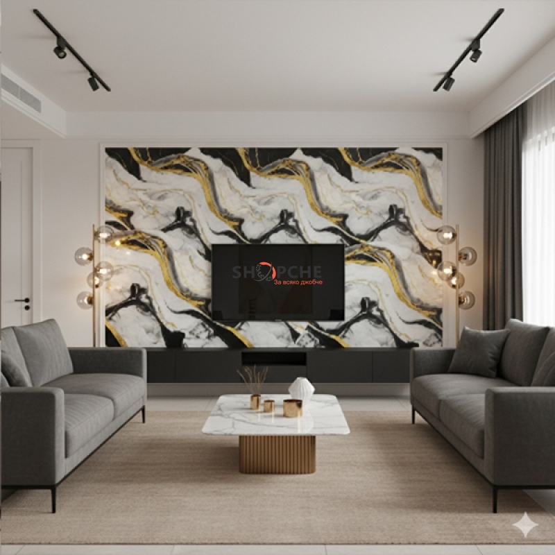 Този черно-бял PVC панел с мраморен ефект и златни жилки е перфектното решение за всеки, който иска да създаде модерен, луксозен и впечатляващ интериор.