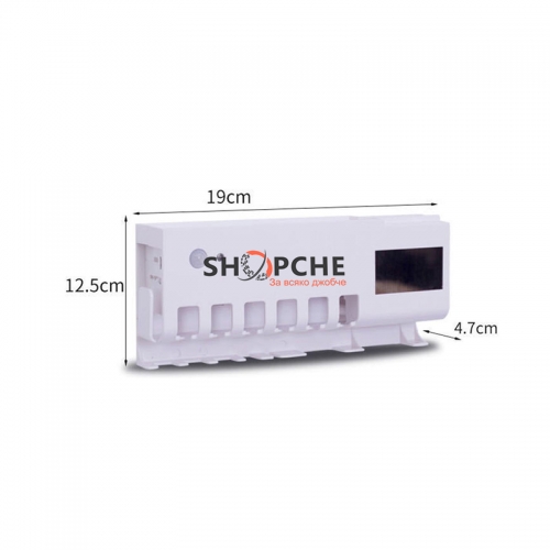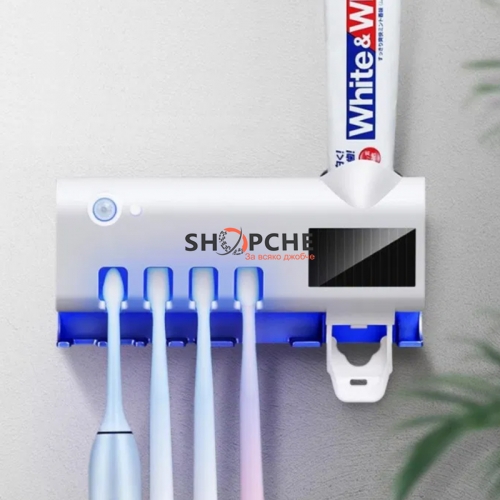 Уредът е комбиниран – има поставка за четки за зъби и дозатор за паста за зъби.