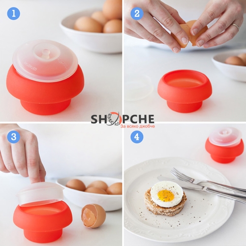 Всичко което трябва да направите е да изсипете яйцето във формата и да добавите желаните от Вас подправки и други добавки, след което да поставите формите във микровълнова или във вряща вода за няколко минути.