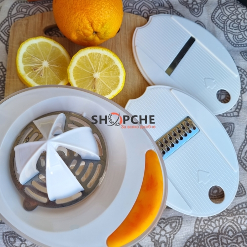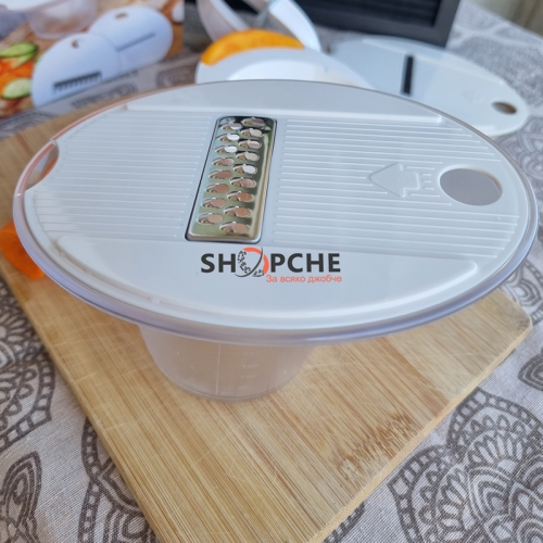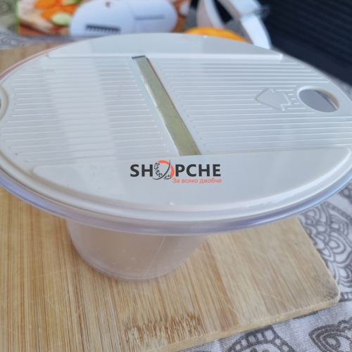 👉 Присъедини се към Viber общносттаКомплекта се състои от различни части като контейнер, преса за сок, ренде за ситно нарязване и ренде за нарязване на ленти.