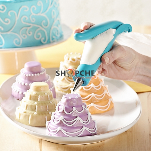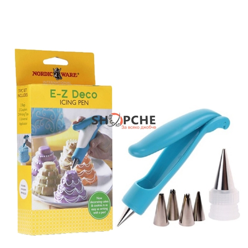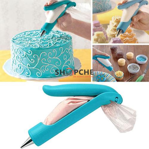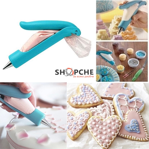 Писалката за декориране на тарталети, торти и десерти се използва толкова лесно – необходимо е само да поставите торбичка с избраният от Вас материал за декориране в писалката и с леки движения на притискате декорирате Вашите десерти.