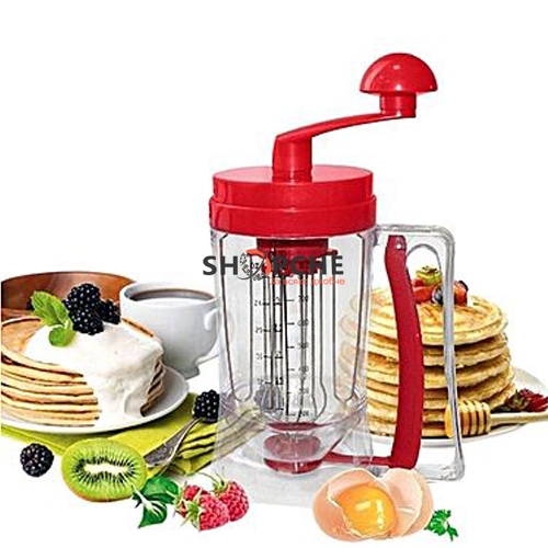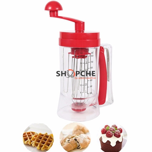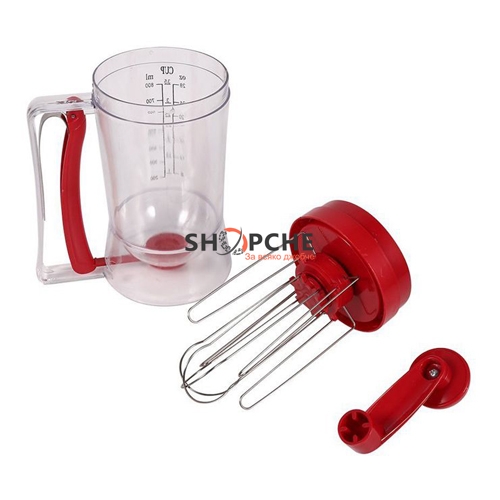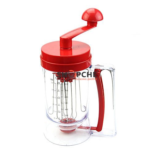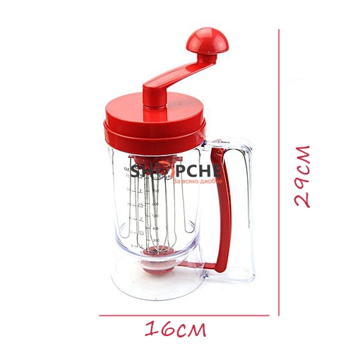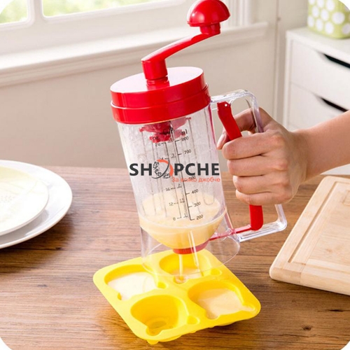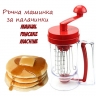Подгответе сместа и я поставете в каната,с помощта на дръжката на капака разбъркайте до получаване на хомогенна смес и със специалния спусък,може лесно да пропускате нужното количество смес направо върху тигана.