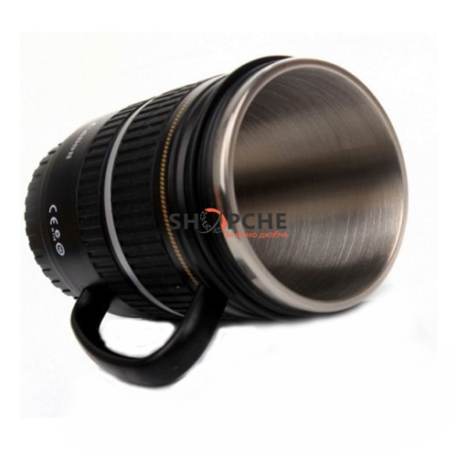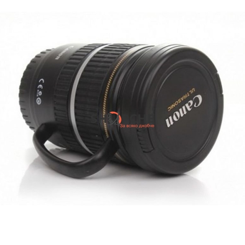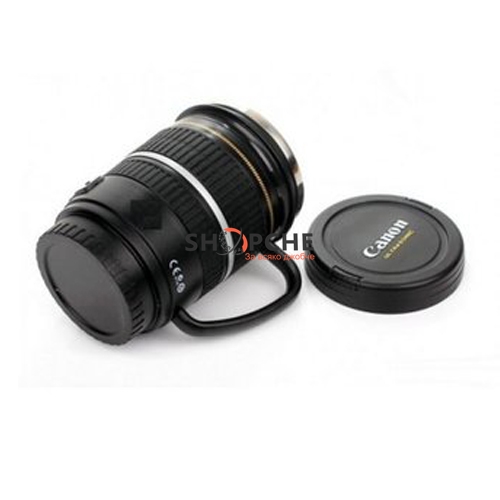 Термос чашата е реалистична и повтаря познатата имитация на истински обектив Canon EF-S 17-55 mm.